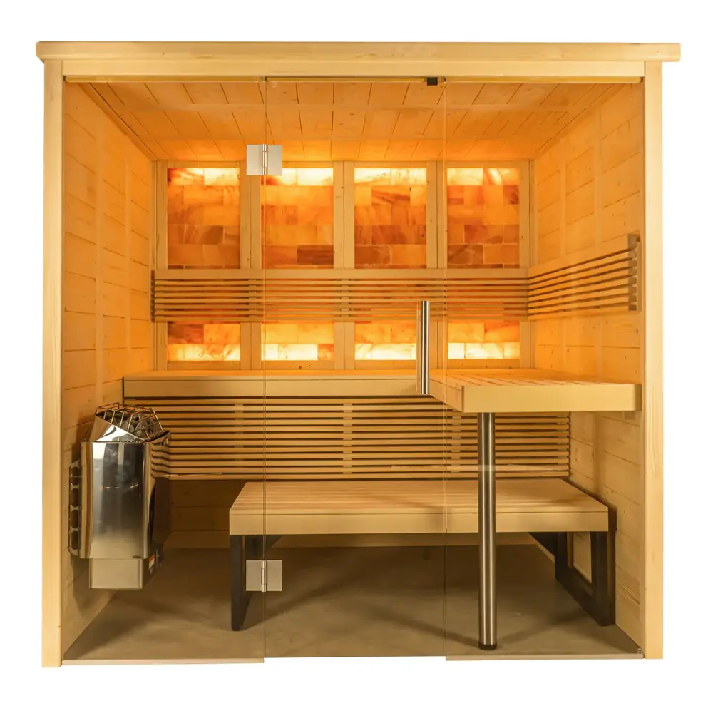 The 6kw heater featured in the Himalaya 4-person indoor sauna delivers exceptional heat, allowing you to revel in sauna temperatures of up to 190°F, ensuring a truly invigorating experience. Constructed from smooth-grain Nordic spruce lumber, its horizontal and vertical board designs not only provide durability but also complement your home decor beautifully. The full-glass front of this sauna creates a spacious and inviting atmosphere, seamlessly blending with any interior design.
